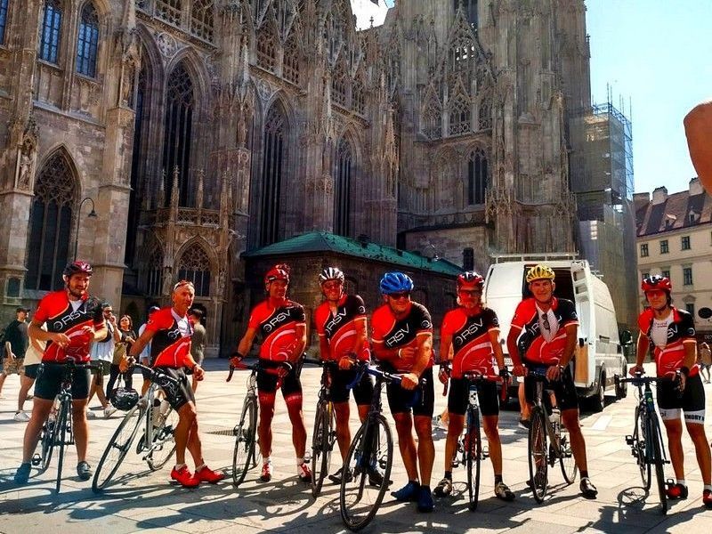 Vor imposanter Kulisse – im Hintergrund die das Wiener Stadtbild prägende Domkirche Sankt Stephan - postierten sich die acht RSV-Kettensprenger nach durchfahrener Nacht zum obligatorischen Zielfoto. Die Strecke nach Wien - 465 Kilometern mit eingeschlossenen 3180 Höhenmetern - hatten sie zuvor in einem Rutsch bewältigt. Von links: Stephan Freundl, Michael Freundl, Hermann Koppold, Siegfried Veitinger, Leonhard Hiereth, Oskar Seidel, Anton Karmann und Andreas Babl..