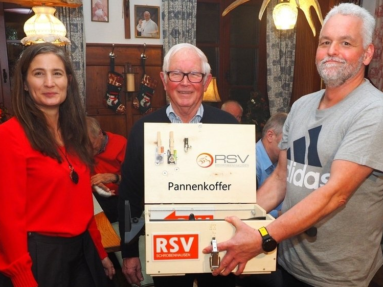 Zum Abschluss seiner Betreuerkarriere hat Tüftler Uli Kreiß (Mitte) - über zwei Jahrzehnte als Fahrer des Spargeltour-Besenwagens aktiv – im Rahmen der RSV-Weihnachtsfeier einen von ihm selbst gebauten und mit allen erforderlichen Werkzeugen und Ersatzteilen ausgestatteten Pannenkoffer für liegengebliebene Radfahrer an seinen Nachfolger Thomas Fieger (rechts) und RSV-Geschäftsführerin Melanie Eichmair (links) übergeben.